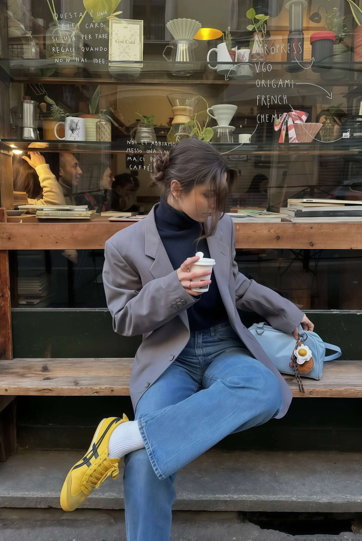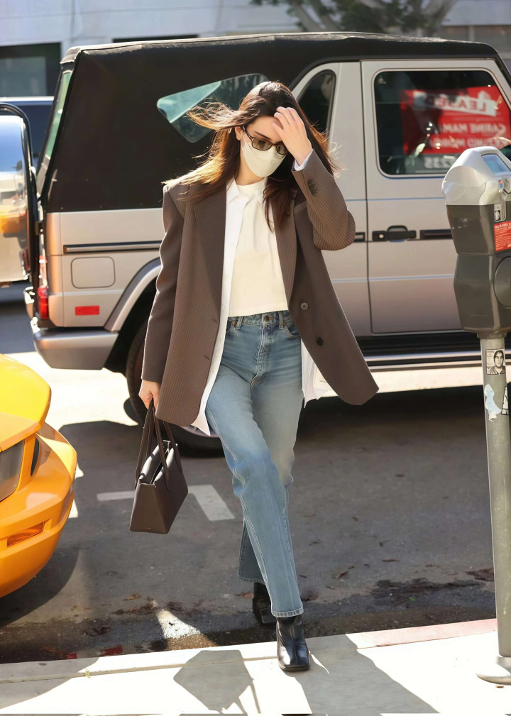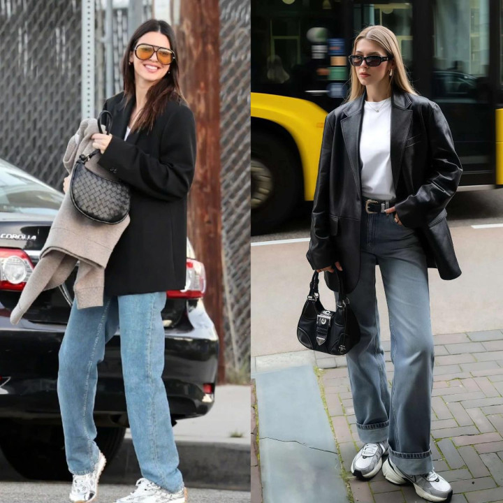 这组搭配能火不是没意旨的,西装的挺括版型撑起气场,牛仔裤的宽松剪裁藏住腿型残障,一刚一柔搭在一齐,比单穿西装裤少了刻板,比单穿牛仔裤多了质感,春天穿它外出回头率高得很。