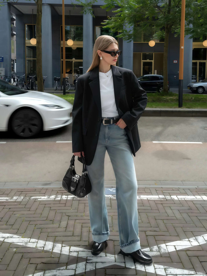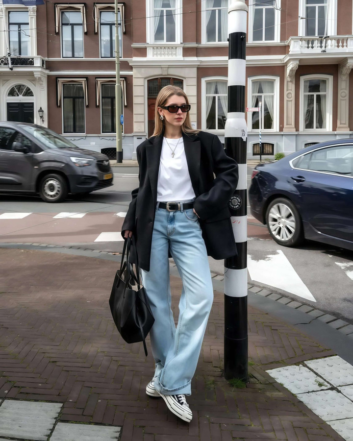 这组搭配是“西装+牛仔裤”的经典公式,玄色西装自带气场,白T恤干净显露,浅蓝牛仔裤空闲百搭,三个单品放在一齐,情态端倪分明,作风均衡得刚刚好。