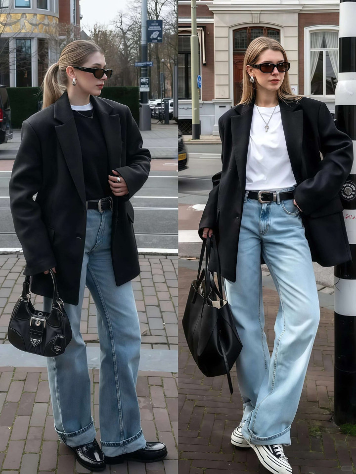 黑西装选H型微宽松版型,白T恤选圆领或V领基础款,豪门国际娱乐浅蓝牛仔裤选直筒或微喇版型,鞋子配小白鞋或乐福鞋,整套搭配不祥利落,相宜通勤、逛街、约聚各式景色。