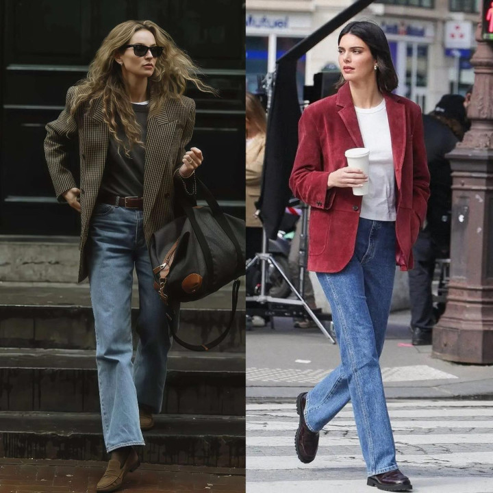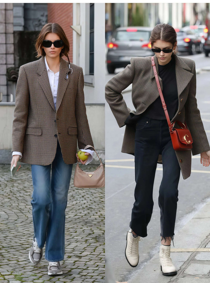格纹西装的情态提出选是非格或灰白格,这两个配色最经典,深蓝牛仔裤选直筒版型,裤长到脚踝,配一对尖头短靴或乐福鞋,相沿感拉满。