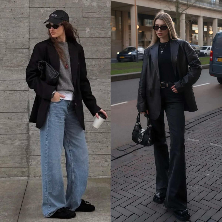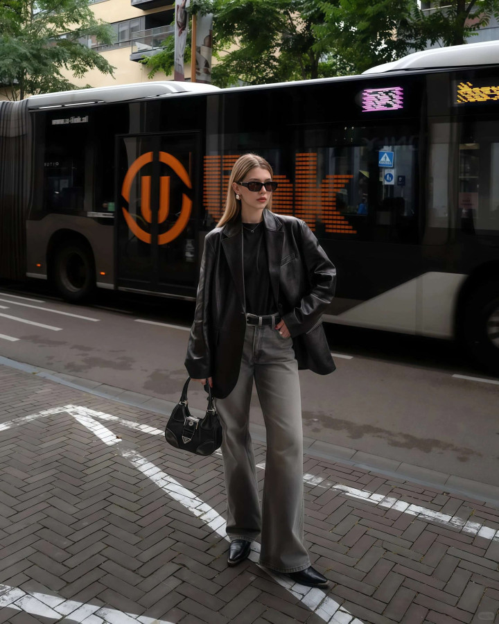 ✓ 皮质西装也能配牛仔,酷感平直翻倍